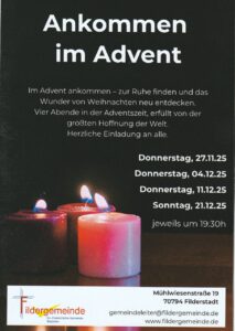 Unter der Woche treffen sich wir uns in Hausgruppen, um den Glauben und die Gemeinschaft zu vertiefen. Bei Interesse kannst Du gerne reinschnuppern – Du findest uns in der Mühlwiesenstr. 19 in Filderstadt.
